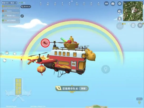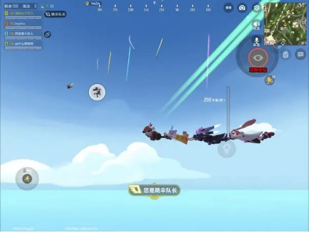 3.派对开始后,所有玩家乘坐飞行巴士飞过派对地图上空,玩家通过点击屏幕上跳伞按钮,自由选择降落地点。(跳伞前可点击右上角地图,在大地图上点击标记落点)