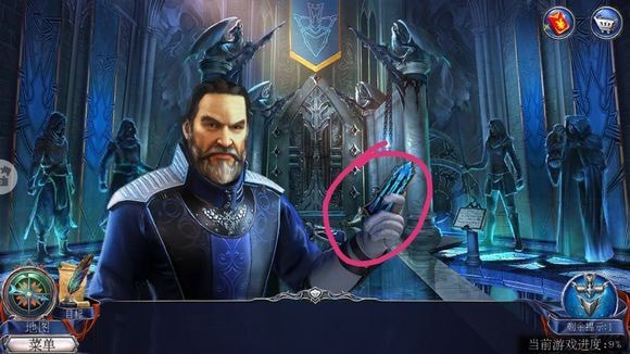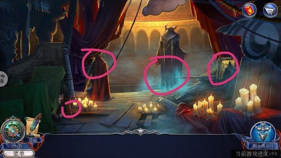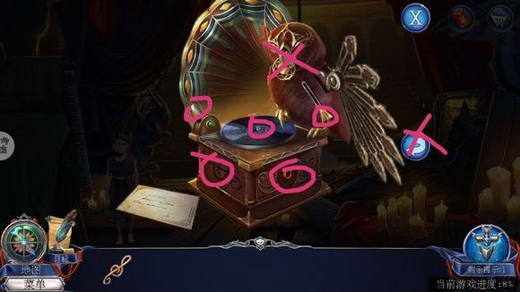 圆顶左侧,暗门——放机械面罩,放暗门密码——根据提示调整——进入【剧场后台】