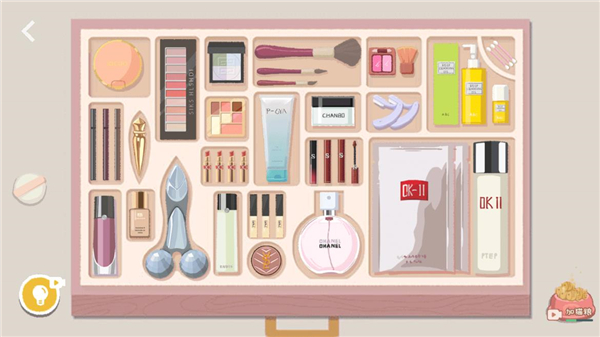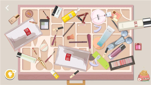 2、根据系统给出的收纳提示,将口红、睫毛膏、粉饼、腮红等化妆品一一放入对应位置。整理时注意摆放方向和层次,只有位置正确才能触发收纳判定。