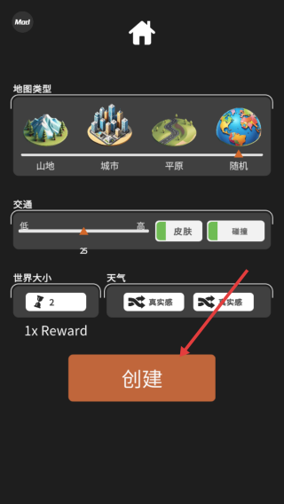 3、进入设置界面,设置地图类型、交通、世界大小、天气等,然后点击【创建】按钮开启游戏。