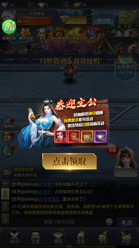 创角即送神将貂蝉,满V、GM特权、百连招募、300万绑元、一亿银两,激活特权白嫖各种活动。