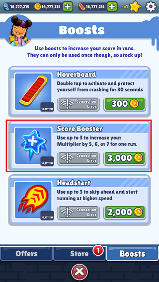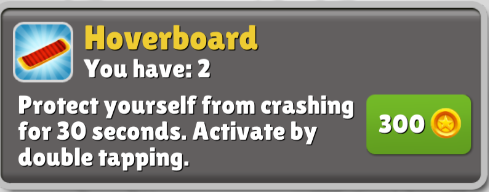 双击屏幕可启动滑板道具,如果在没有启动滑板功能的情况下,角色撞上障碍物或者火车游戏就会结束,而在滑板状态下,等于给角色买了保险,滑板会在撞到障碍物时消失,但游戏可以继续进行。滑板在消失后的几秒内出现冷却时间,当闪烁结束后可通过双击再次启动,没有次数的限制。
