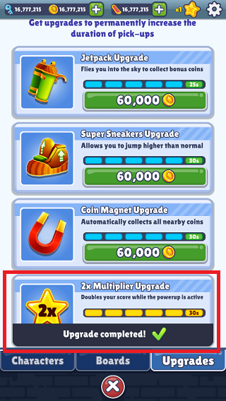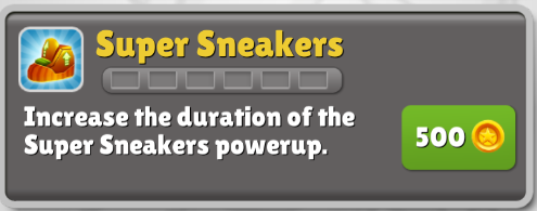 增加角色的弹跳能力,可以跳跃更高更远,在空中停滞的时间更长,不过落地时间很难掌握,使用该道具可以跳上火车,同时也可以在洞口处跳到墙上自杀。不过劝诫新手朋友不要过多使用,一时恍惚做出了错误判断就可能导致游戏结束,然而对于高玩们来说,这却是一款不折不扣的神器,凭借超级运动鞋可省去细微的费神操作,效率提升也十分明显。