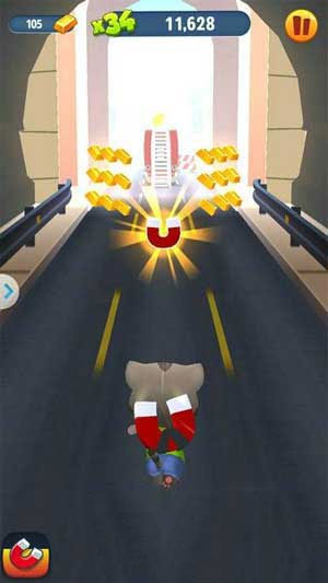 怎样才能在短时间内收集到更多金条?很简单,用“磁铁”!这个道具可以把界面中所有金条“吸”过来,因此,只要当前行进路线上不出现大型障碍物,玩家无需变道也能收集到很多金条。不过,磁铁与头盔一样,都只能在限定时间内发挥作用,玩家可以通过升级角色的“磁铁持续时间”属性,获得更长久的“吸金”效果。