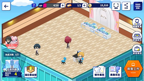 如果大家想给自己喜欢的小偶像做衣服布置房间,就要常打开事务所了。事务所级别2后,各项功能才会开放。