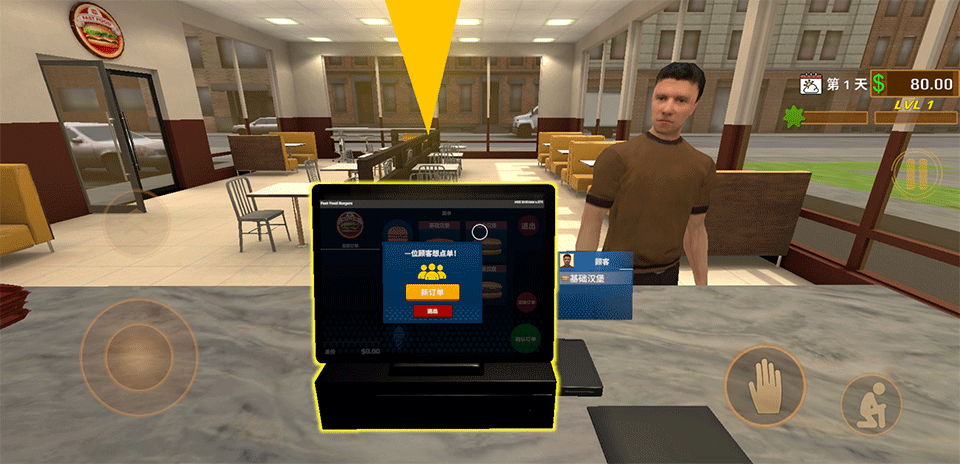 1、进入快餐革命游戏后,首先操控角色来到点单台,等待顾客上前点餐。当有客人提出需求时,点击收银电脑进入点单界面。