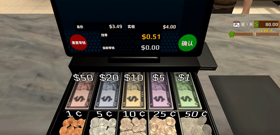 3、若顾客选择现金支付,系统会自动显示应找金额,玩家需要根据提示准备好零钱并交给顾客。