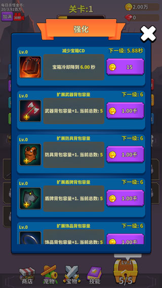 4、点击强化,你可以强化自己的宝箱CD,以及背包容量;