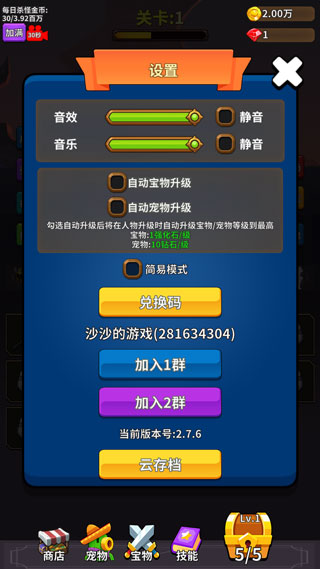 7、另外,点击设置,你还可以设置自动宝物和宠物升级,以及云存档游戏。
