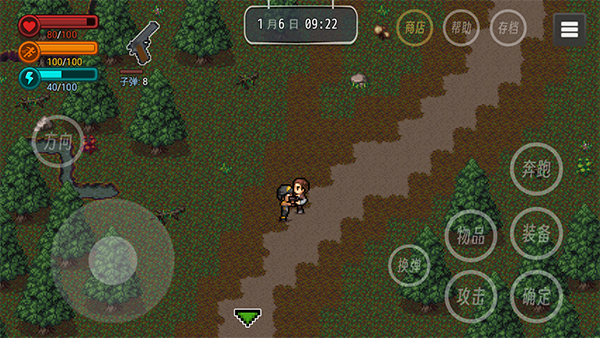 2、操作界面没有改变,依然是左下角轮盘操纵,右边有物品和装备等状态栏,存档和末日生存指南在右上角
