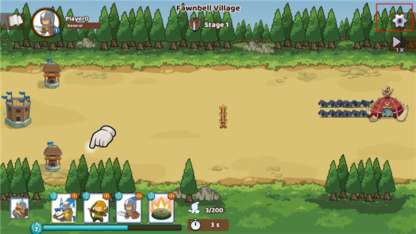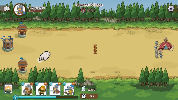 成功进入关卡后,在界面的左侧下方,分别是你可用的队伍,蓝色条能是你的能量,不同队伍的招募需要对应的能量才能进行,比如炮兵需要4格、弓箭手需要3格、地雷需要2格、骑兵需要3格,后续玩家还能解锁更多兵种。关于放置,只要满足一定的能量后,拖动屏幕上的兵种到战场上即可