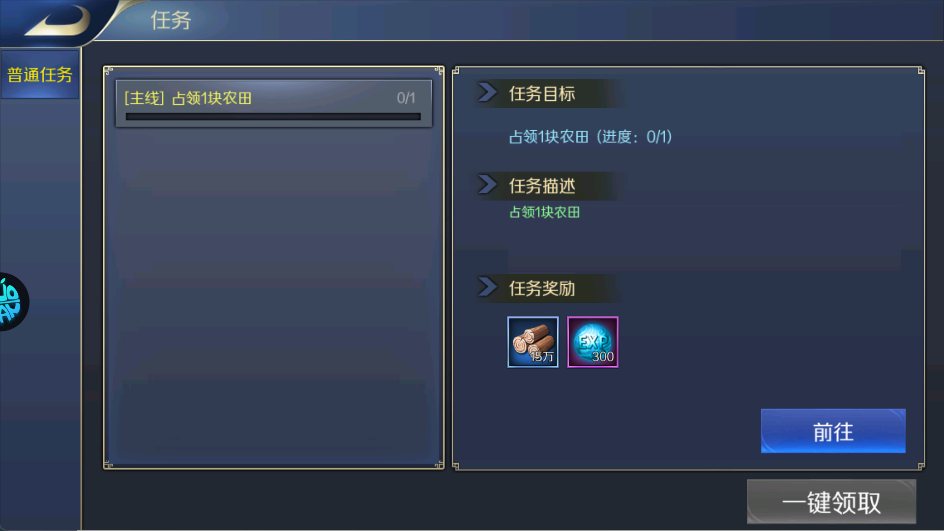 先完成“占领快农田”主线任务,获取粮草与经验,推进主线是前期升级和解锁功能的核心路径。