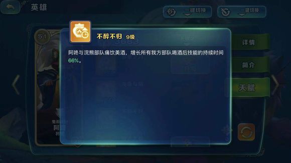 除了这个龙龟专精技能的恐怖加成,阿咚的不醉不归技能,还能增长我方部队喝酒后的技能持续时间,本身龙龟一鼓作气持续25秒,在9级不醉不归加成下就达到了41.5秒,如果有双龙龟的话也就是1分23秒的48%加成,这也是开发出双龙龟砸墙攻略的一大基础。