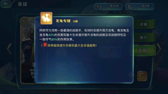 阿咚的龙龟专精技能,姑且不谈统帅属性带来的技能效果,在点满9级情况下就能提升龙龟战鼓和双战鼓效果的60%。而本身双战鼓效果是开场25秒内,提升我方附近军团15%攻击力、攻速和生命值上限,并在喝水情况下触发一鼓作气,加成效果翻倍达到30%。