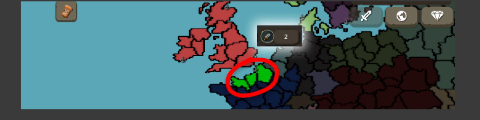 绿色闪烁表示您可以攻击或占领该领土。 只需单击那些绿色闪烁并单击剑图标即可创建战斗或占领领土。如果你看不到任何绿色闪烁,可能你还没有向任何人宣战,或者你没有足够的攻击点,攻击或占领领土会消耗 1 个攻击点,但每回合会重置为默认值。您可以增加对学院的这些限制。