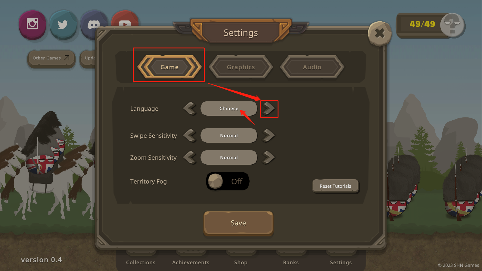 跳转页面后,首先点击【Game】,其次点击【>】,直到看见Chinese这个英文出现,就代表已经切换了中文,最后点击【save】保存