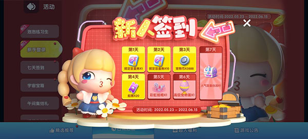 萌新期间(账号注册前七天),每日按时游戏登陆签到,每天都能获得惊喜礼物,更有盲盒券送你,助力开盒欧气满满~更有彩虹摇椅、高级宠物蛋等稀有奖励等你来拿。