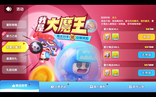 活动期间,参与休闲模式、排位模式,累计淘汰人数到达指定数量,即可领取对应奖励,盲盒券,道具礼包,金币满满应有尽有!