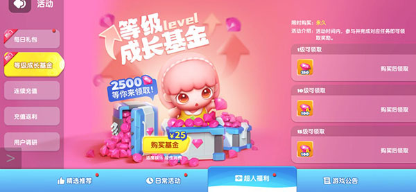 看到各种好看的装饰和角色,小孩子才做选择,我全要!可是钻石不够怎么办!等级成长基金来解决,在活动时间内,参与并完成对应任务即可领取奖励。
