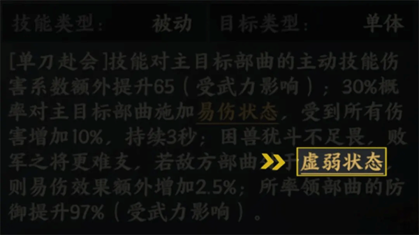应用场景:易伤效果能提升集火收益与技能联动的效率(如程昱多段伤害),非常适配大多需要高爆发压制的部曲,战场中可以给需要集火的敌方部曲施加易伤效果,来更快的实现减员。