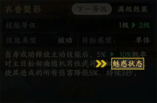 【魅惑状态】:在魅惑状态期间,敌方武将造成的所有伤害降低