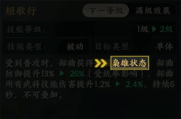 【枭雄状态】:在枭雄状态期间,部曲防御提升,部曲所有武将技能伤害提升