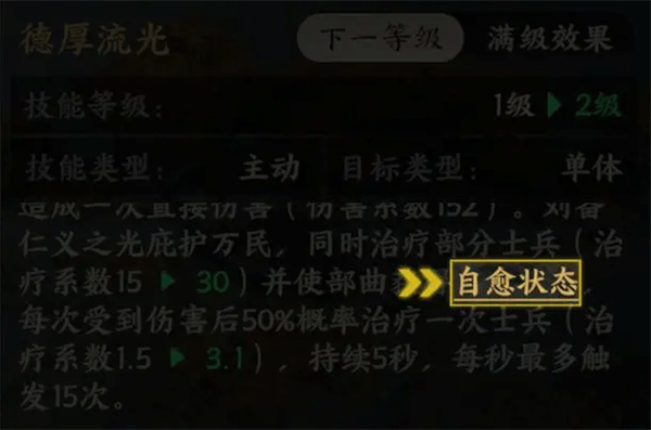 【自愈状态】:在自愈状态期间,每次受到伤害后有一定概率治疗一次士兵