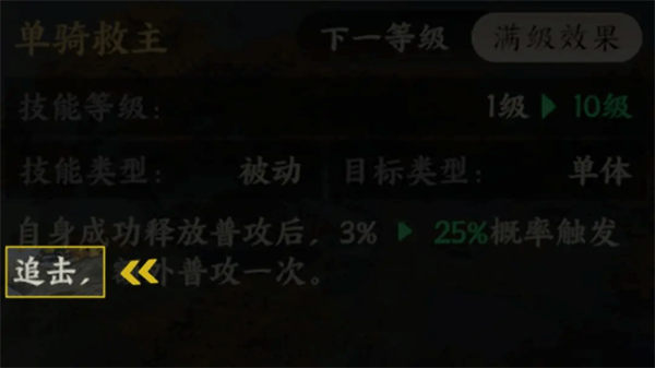 【追击】:自身释放普攻后,概率触发追击额外普攻一次。