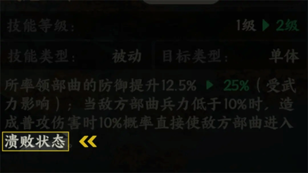 【溃败】:敌方部曲兵力低于一定比例时,造成普攻伤害有概率使敌方部曲溃败。