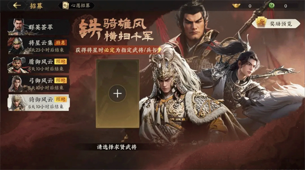 赛季定向卡池根据兵种分为三类:弓御风云、骑御风云、盾御风云。每个卡池均支持选择一名【将星】武将作为UP目标,大幅提升其抽取概率。此类卡池主要用于补充队伍核心武将或关键兵书,帮助快速完善阵容体系,以更低成本实现战力跃升。定向卡池根据赛季阶段限时开放,每赛季仅开启3轮。