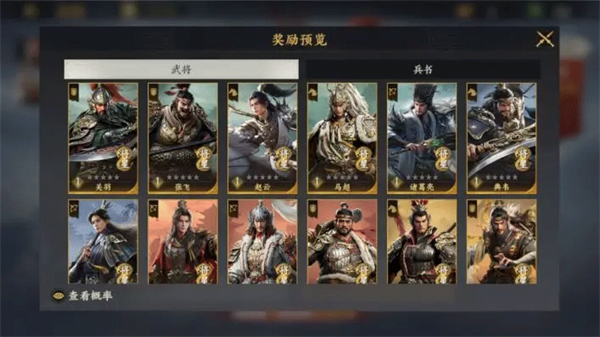 卡池中除武将本体外,还会产出其专属兵书。消耗1本兵书解锁觉醒技能,后续可通过消耗同名兵书提升觉醒技能星级。定向卡池提供特定武将兵书的概率加成,助力快速养成。