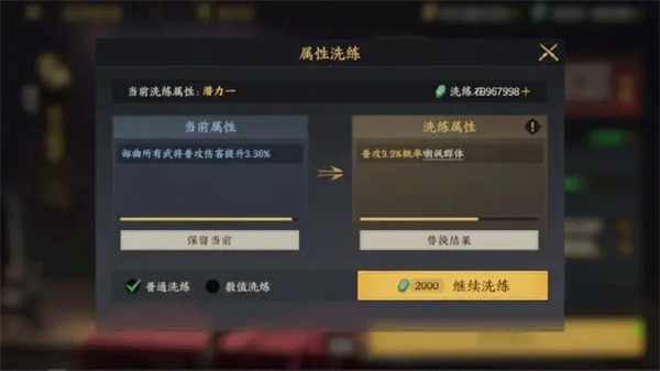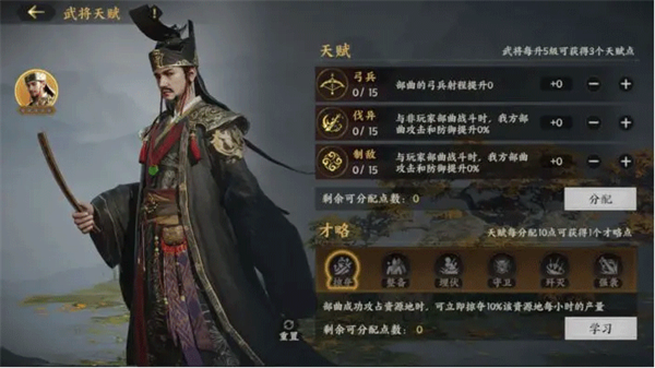 武将升级获得的天赋点和才略点,可自由分配至“天赋”(无冷却重置)或“才略”(重置冷却36小时)。不同配点策略将影响队伍整体强度,建议根据战局需求灵活调整。