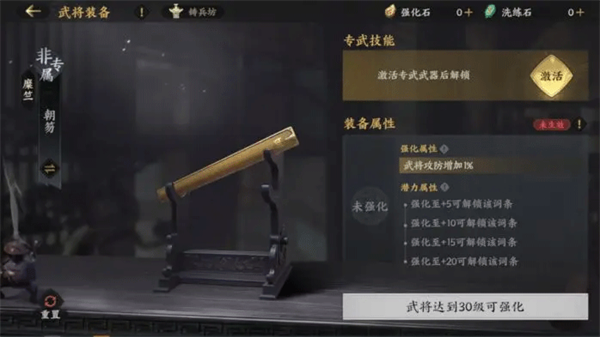 武将30级且达成天下大势“谋定后战”阶段后,解锁唯一装备槽。装备可通过强化激活随机词条,不同强化等级对应独立词条库,词条支持洗练。强化材料与洗练石可通过日常活动免费获取。