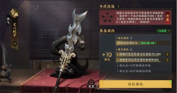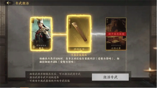 解锁武将觉醒技能后,免费激活其专武技能。专武技能可通过消耗同名专武图纸(武将将符或兵书残卷溢出后可兑换)提升星级,获得专武技能的提升,进一步强化武将核心能力。