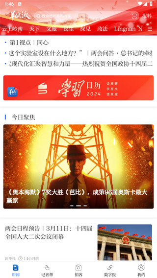 1、打开羊城派app,登录进入首页,用户可在首页查看每日新闻要闻、今日焦点等,点击我的;