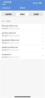 8、回到【stream】点击结束抓包,历史抓包,找到日期,然后点击【按域名】。