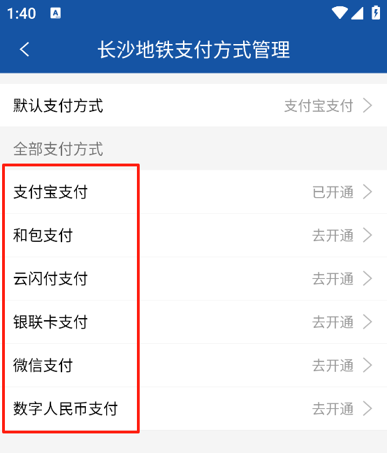 5、长沙地铁App支持下列支付方式,用户按需绑定即可