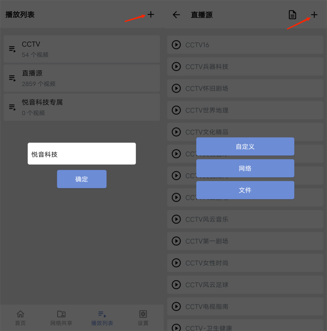 4、另外还提供了网络在线播放功能,只需要在播放列表页面,点击右上角+字符号,输入直播名字,再次重复点+,然后输入流媒体的地址就可以了,直接摇身变电视看直播。