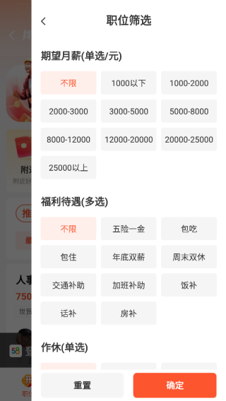 3、点击筛选可进入筛选界面,根据条件进行精选,过滤不符合条件的招聘信息