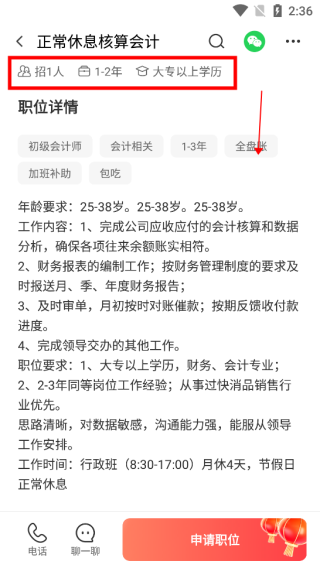 4、遇见满意的职位可点击进入,上方可以看到招聘要求,下方可看到具体的职位详情,合适的话可以点击申请职位等待HR回复