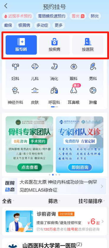 2、可以根据【专科】、【疾病】、【医院】来筛选进行挂号