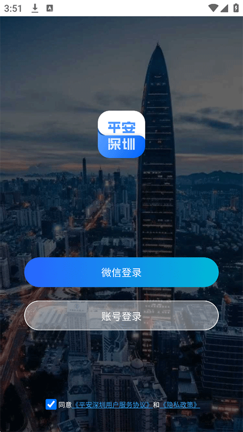 1、打开平安深圳app,勾选底部的“同意《平安深圳用户服务协议》和《隐私政策》”,并点击“账号登录”;