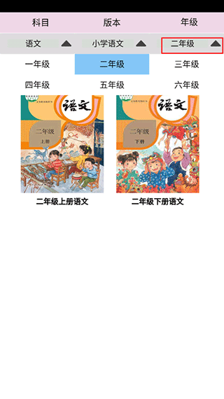 1、进入软件页面,可以选择年级来找到需要的课本