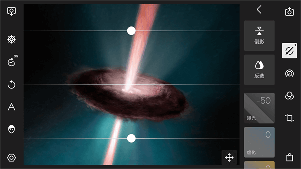 3、常规即是用手指滑动控制各项参数。许多修图工具都是如此,例如 Snapseed、Enlight。备选则是使用陀螺仪控制参数,长按色块,左倾或右倾手机改变数值。这点确实让人耳目一新,原来手机上还可以这样修图 !