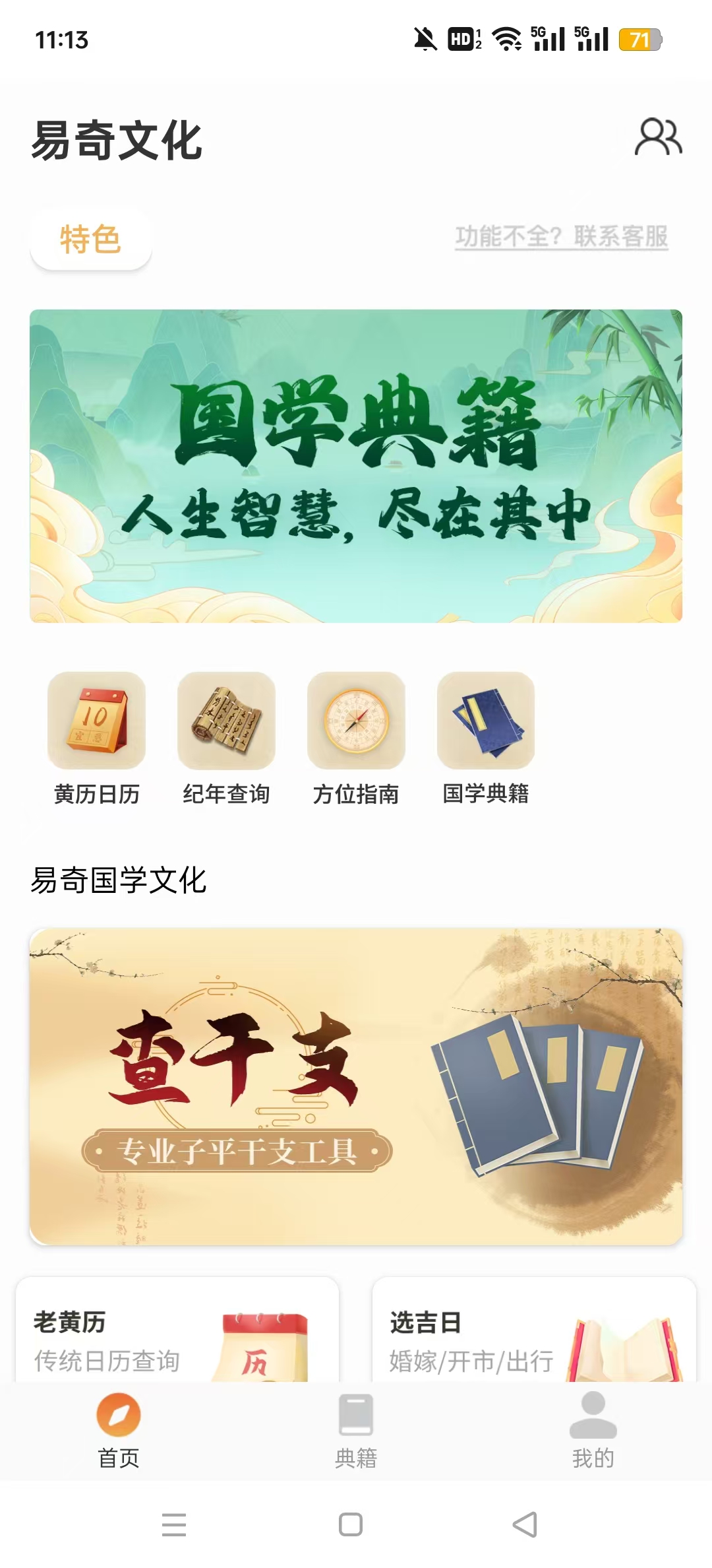 易奇文化app是一款具备多种功能的国学软件,它集合了老黄历、方位指南、国学典籍、八字排盘等各种命理风水和传统文化,通过这款APP,用户可以随时查阅每日黄历,了解宜忌事项。易奇文化app里面准备了大量经典国学典籍,如《周易》《道德经》《论语》等,而且还有不少佛经,让一些喜欢研读古籍、修身养性的用户随时查阅。易奇文化app还有着许多与命理风水相关的工具,让想要安排婚嫁、出行、动土等重要事宜的用户有了可以查阅的方法。
