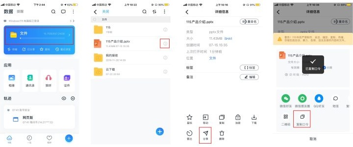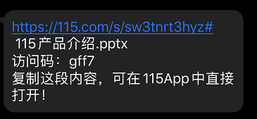 ③「口令分享」:帮助用户之间的分享变得方便,复制口令后在「115App」打开即可转存。