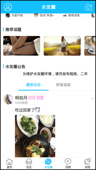 4、点开水友圈,有交友、邂逅、话题、附近等,还可以查看其它用户发布的动态;
