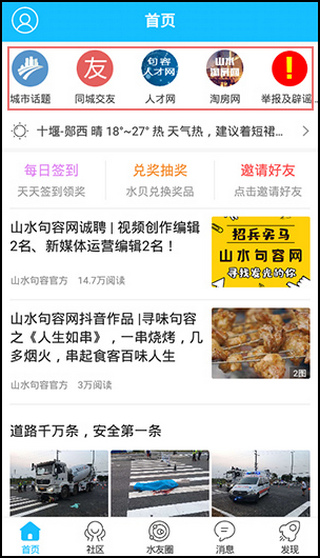 1、在本站下载安装山水句容网app,在手机上运行软件,可以看到有首页、社区、水友圈、消息、发现五个板块;