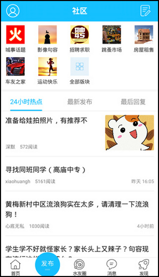 3、点开社区,有招聘求职、房屋租售、车友之家、运动快乐等板块,还可以查看最新的本地资讯;
