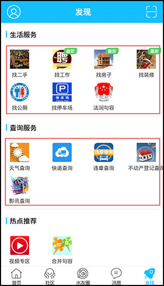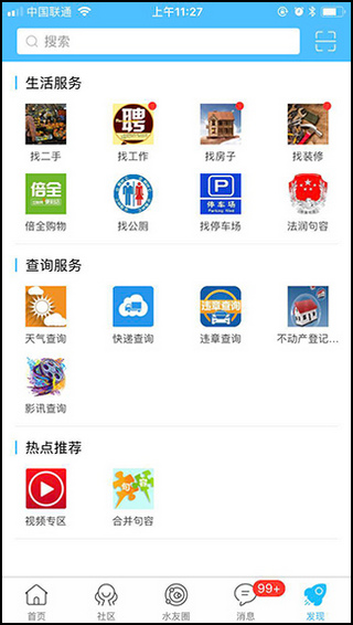 5、点开发现,有找工作、找 装修 、天气查询、快递查询、违章查询等各种服务。
